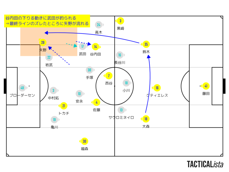 横浜が可変ビルドアップに攻撃の糸口を見出そうとしていたのに対して、栃木が狙っていたのが右サイドに流れる矢野にボールを入れること。矢野はボールを貰いに谷内田が下りるタイミングに合わせて武田の裏に流れることが多かった。サイドに起点を作りつつ岩武を引きずり出すことができればクロスの効果も高められたが、鈴木海音や西谷からのロブパスに矢野がオフサイドを取られてしまうのはもったいなかった。