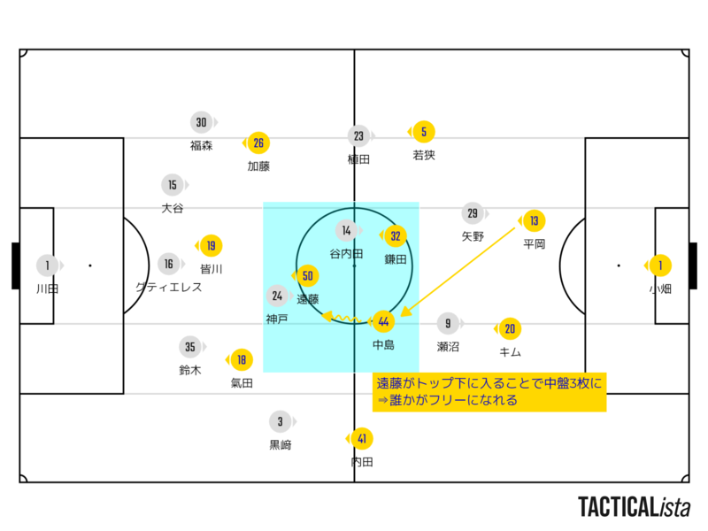 6分、7分と立て続けに植田がミドルシュートを放ったシーンにあるように、谷内田と神戸のコンビは前線へのパス供給でも存在感を示すことができていた。この2人がボランチに入ってからチームとしてレベルアップした部分である。シームレスな動きが可能でミスが少なく、攻撃に停滞感が生まれない。中盤が安定していることから左右CBの鈴木と大谷も思い切りよく攻撃参加することができていた。