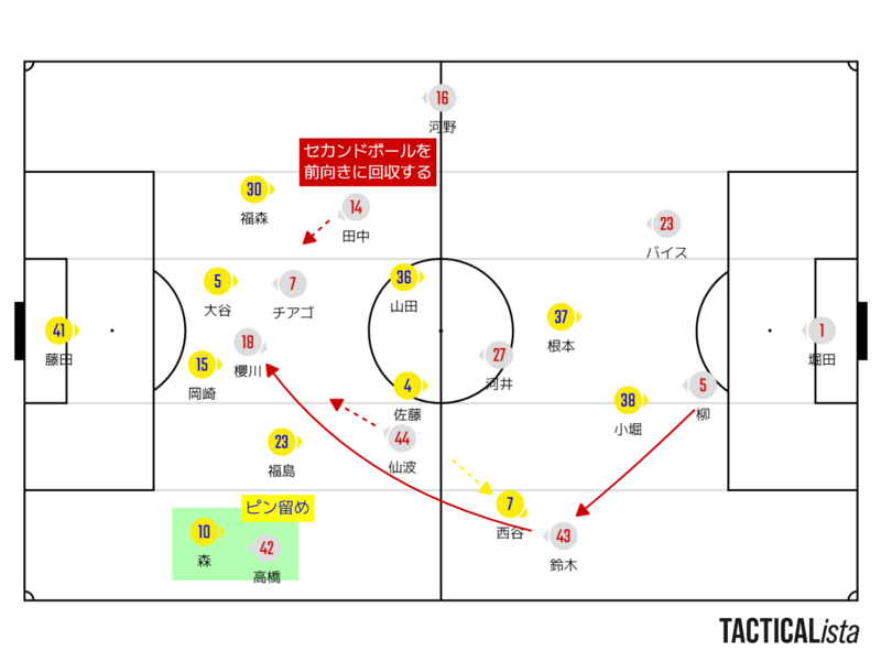 前線から守備の対応関係を明確にしたことでプレスはしっかりと機能していたように思う。少なくとも前節ほど最終ラインに余裕を持って蹴らせることはなかった。